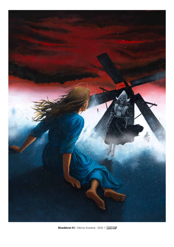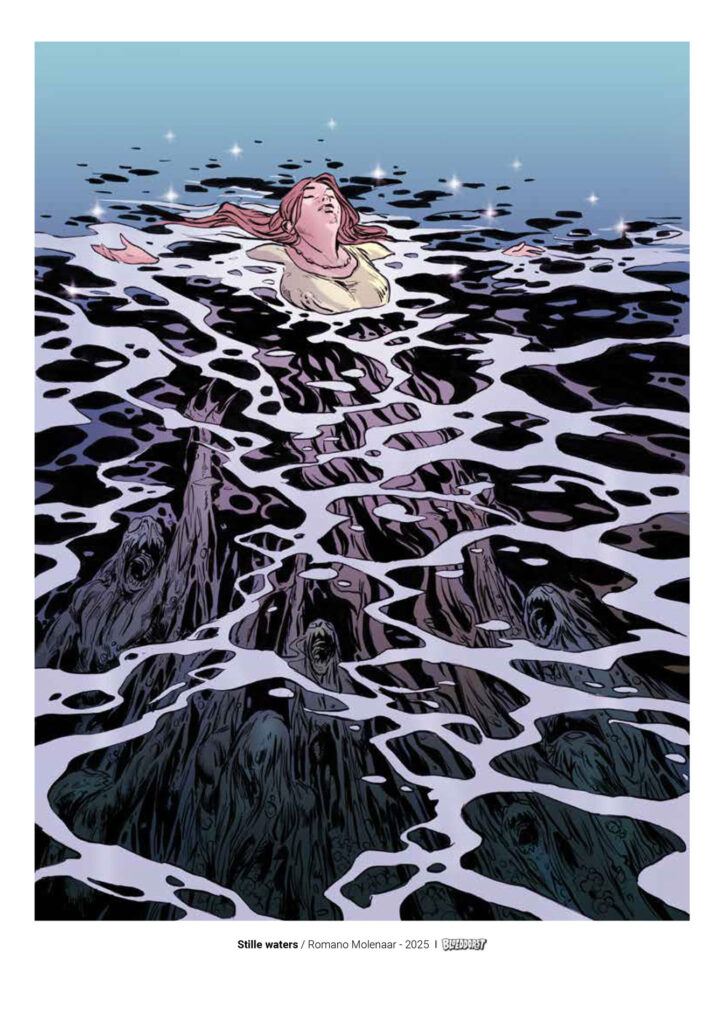 Voor Bloeddorst #2 maakte Romano Molenaar de paginavullende zwart-wit prent ‘Stille waters‘. Deze luxe kunstprint is volledig in kleur.