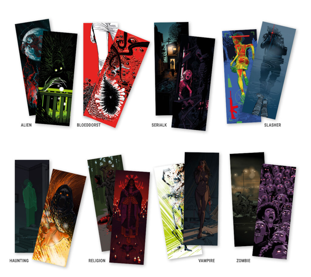 Horrorcontrasten‘, set van acht boekenleggers in de thema’s: alien, bloeddorst, serialk, slasher, haunting, religion, vampire en zombie.