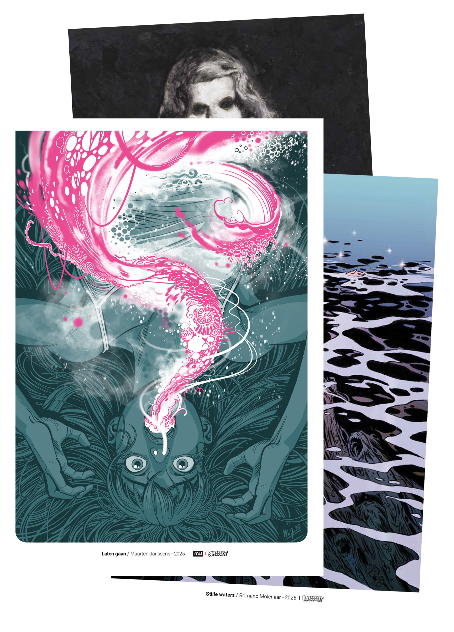 Voor Bloeddorst #2 maakte Romano Molenaar de paginavullende zwart-wit prent ‘Stille waters‘. Deze luxe kunstprint is volledig in kleur.