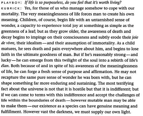 Stanley Kubrick de optimist Mennomail 1 februari 2011 Geplaatst in Overpeinzing Dit stukje tekst kwam ik zojuist tegen op het www en maakte indruk. “However vast the darkness, we must supply our own light”. Auteur: Mennomail