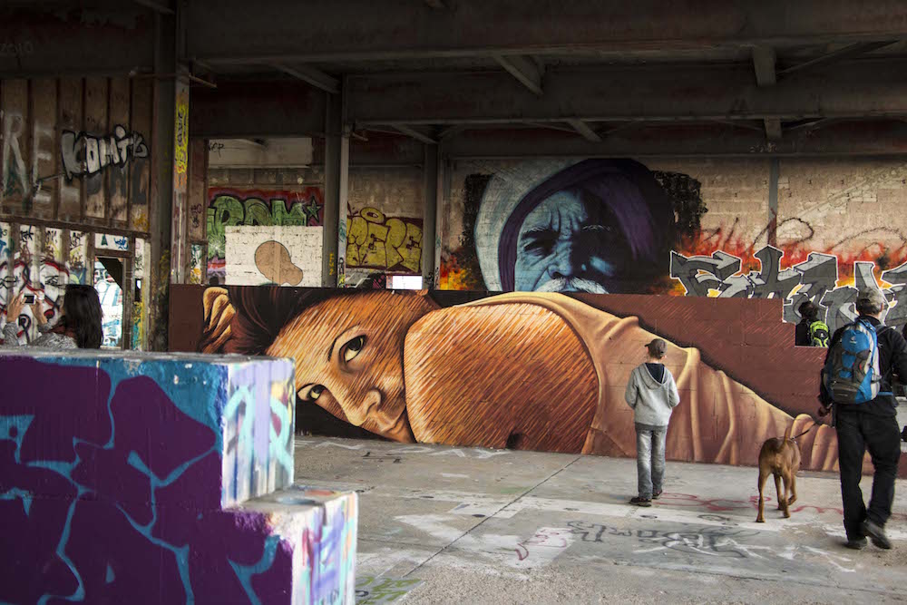 We bezochten de in Berlijn wonende K. en J. die onlangs ouders waren geworden van H. Na het knusse kraamgebeuren beklommen V. en ik de Teufelsberg, een kunstmatige heuvel, hier ligt de puinhoop van het gebombardeerde Berlijn onder, in het voormalige West-Berlijn in het noorden van het Grunewald. De heuvel torent circa 80 meter uit boven het omliggende vlakke land van de deelstaat Brandenburg. De Amerikaanse geheime dienst bouwde een van haar grootste afluisterstations op de top van de heuvel, die nog altijd te bezichtigen is. Een geweldig gebouw dat steeds verder in verval raakt. Het is een walhalla voor street-art liefhebbers en natuurlijk voor graffiti artiesten. En het uitzicht is fenomenaal, zeker bij zonsondergang.